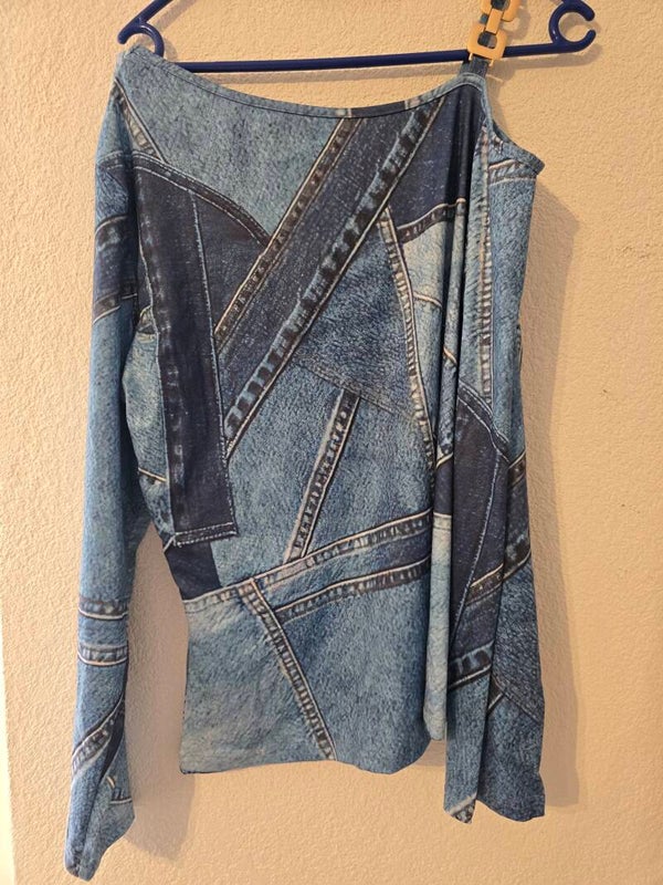 Stylisches Damen Oberteil in Grösse XL mit coolem Denim - Patchwork - Print. Langarm mit asymmetrischem Schulterausschnitt. Aus bequemem Stretch-Stoff. Perfekt für einen individuellen und auffälligen Look.