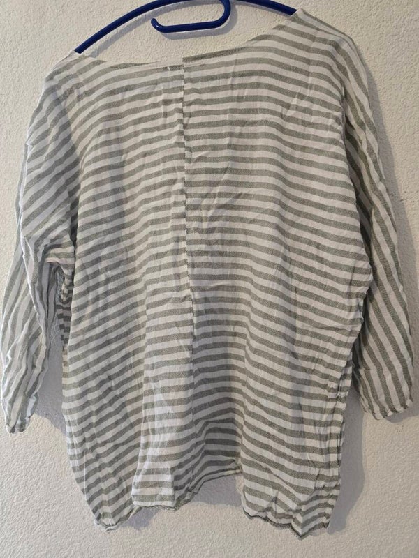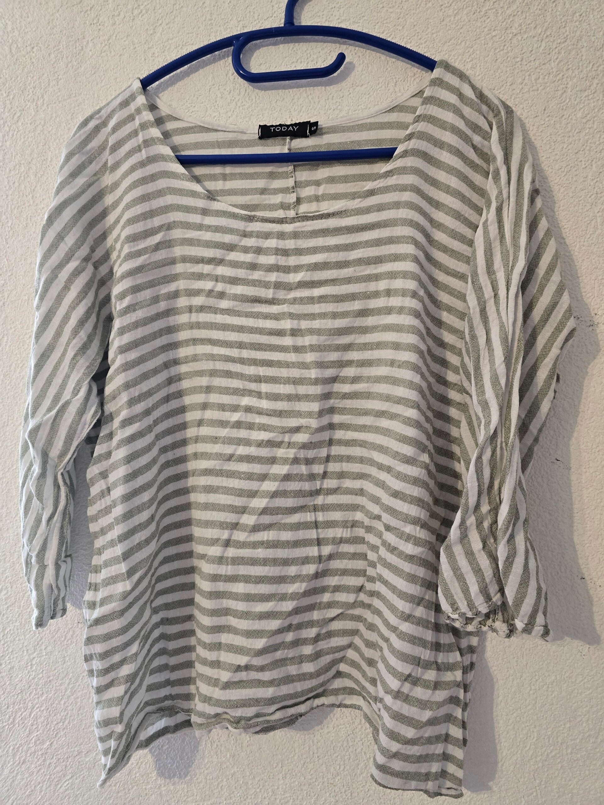 Lässige gestreifte Bluse/Shirt von Today in Grösse S. Klassisches Weiss-Grau-Streifenmuster mit 3/4-Ärmeln und weitem rundhals. lockerer Schnitt, Ideal für den Alltag und Sommer.