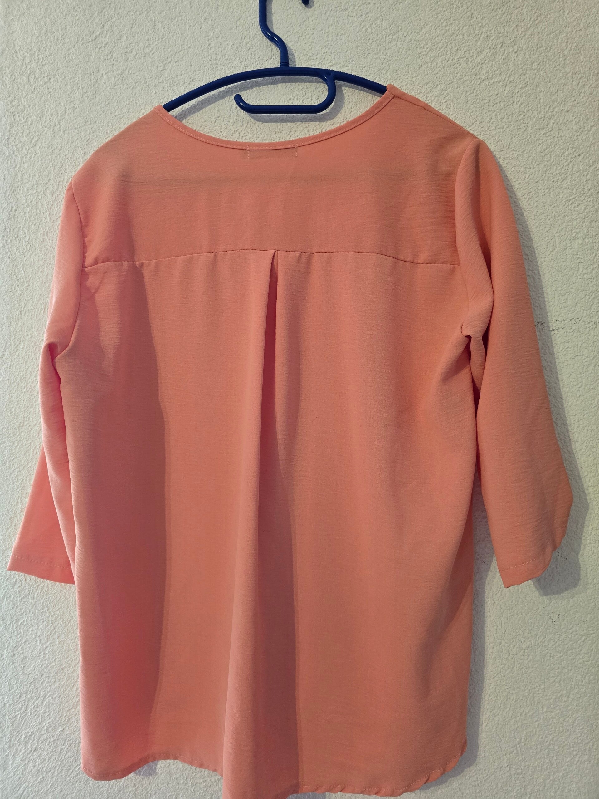 Stylische Bluse von Today in Grösse M in zartem Lachs/Korall. Aus feinem, leichtem Stoff mit dekorativen Knöpfen am V-Ausschnitt. 3/4-Ärmel und moderner Schnitt. Perfekt für einen lässigen Chic.