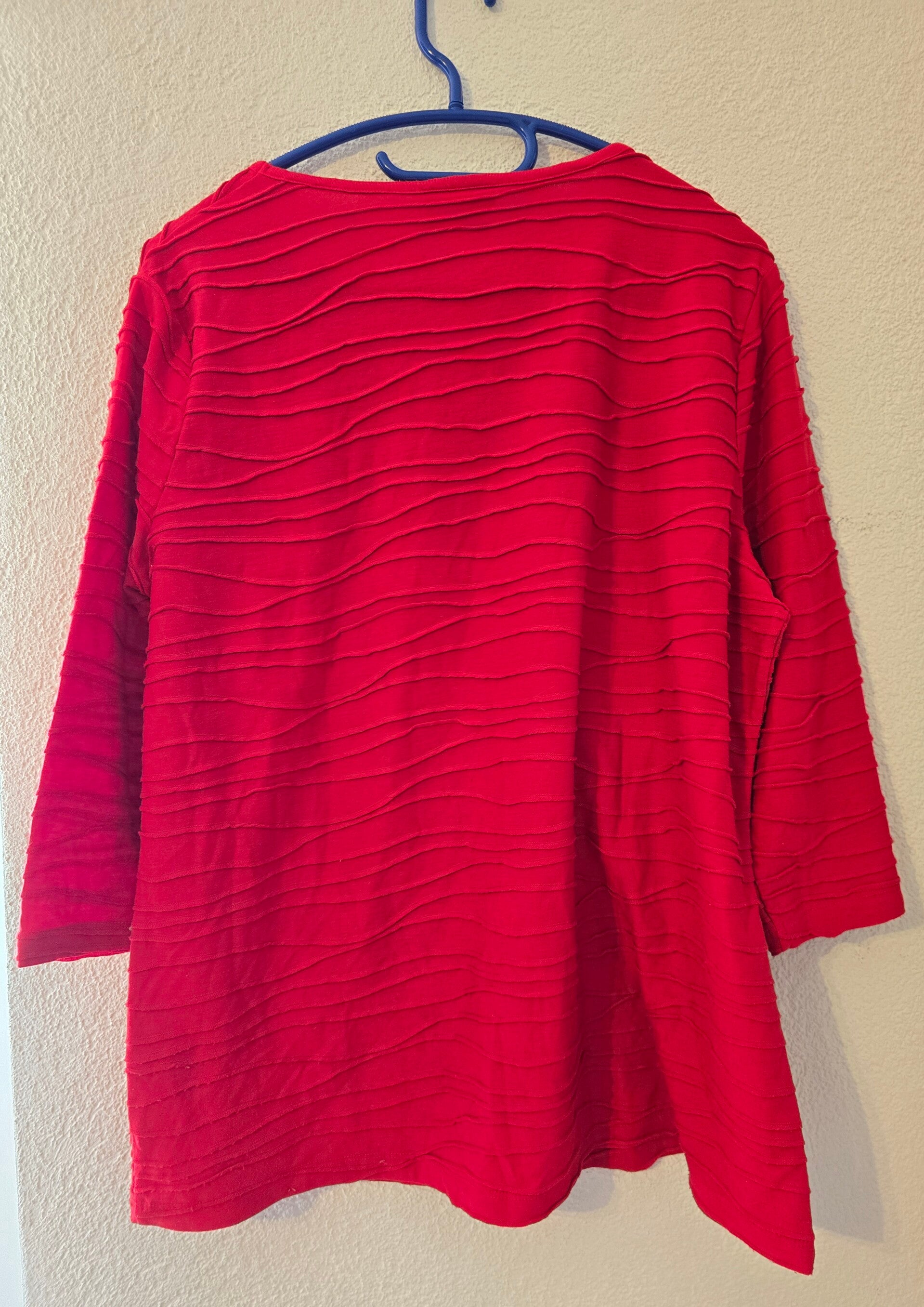 Attraktives rotes Damen T-Shirt der Marke Donna in Grösse L. Das T-Shirt hat einen eleganten V-Ausschnitt, verziert mit feinen Stickerei und kleinen Strass-Applikationen, die auf den Bildern zu sehen sind.