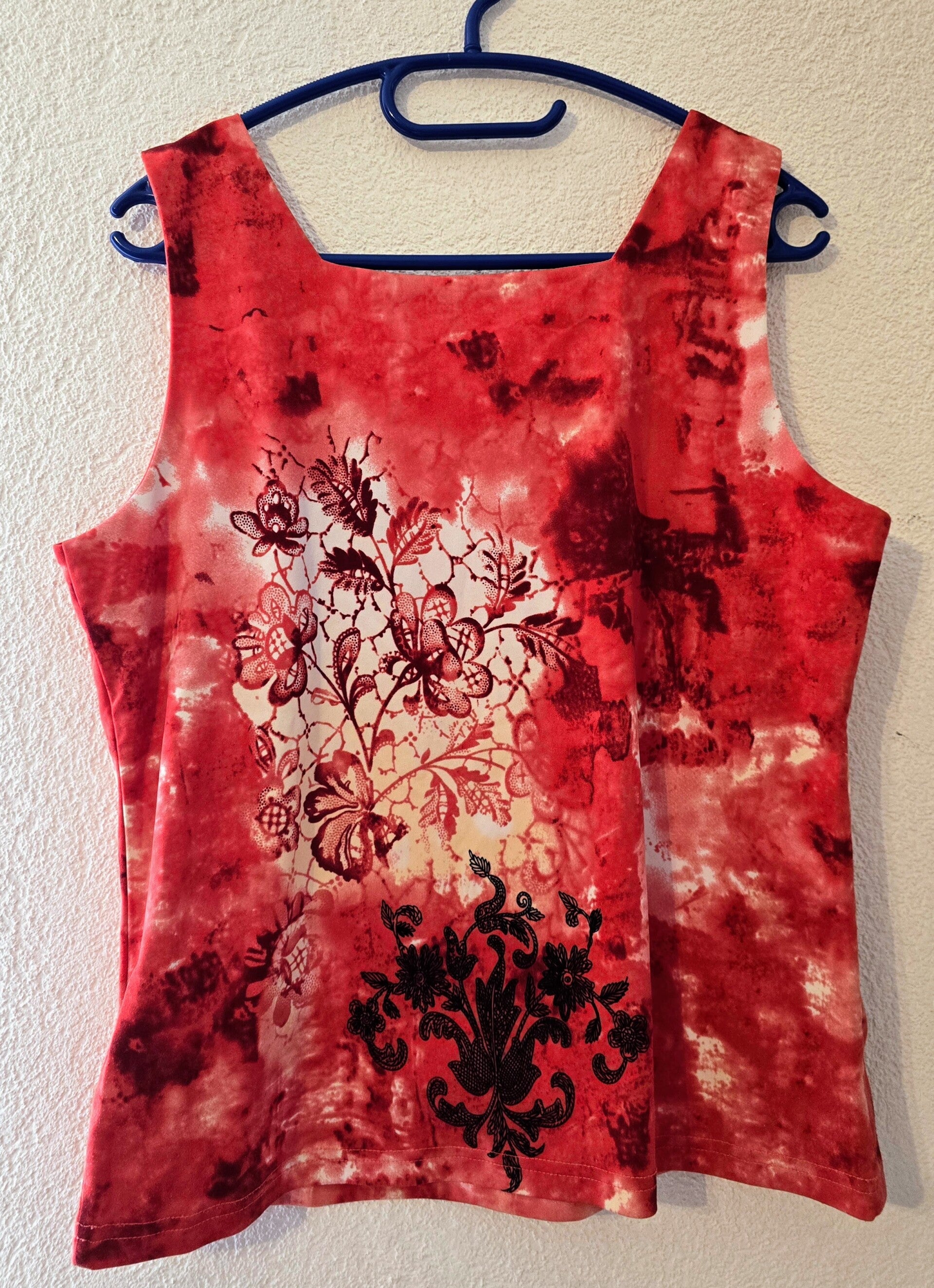Das Top präsentiert sich in lebhaften Rot - und Beigetönen mit einem modernen Batik- oder melierten Effekt. Es ist auf der Vorderseite mit einem detaillierten schwarzen und beigen Blumen- und Rankenmuster im orientalischen Stil verziert. Der eckige Ausschnitt und die breiten Träger sorgen für eine angenehme Passform. Hergestellt aus 100% Polyester, ist es pflegeleiccht und ideal für den Sommer.