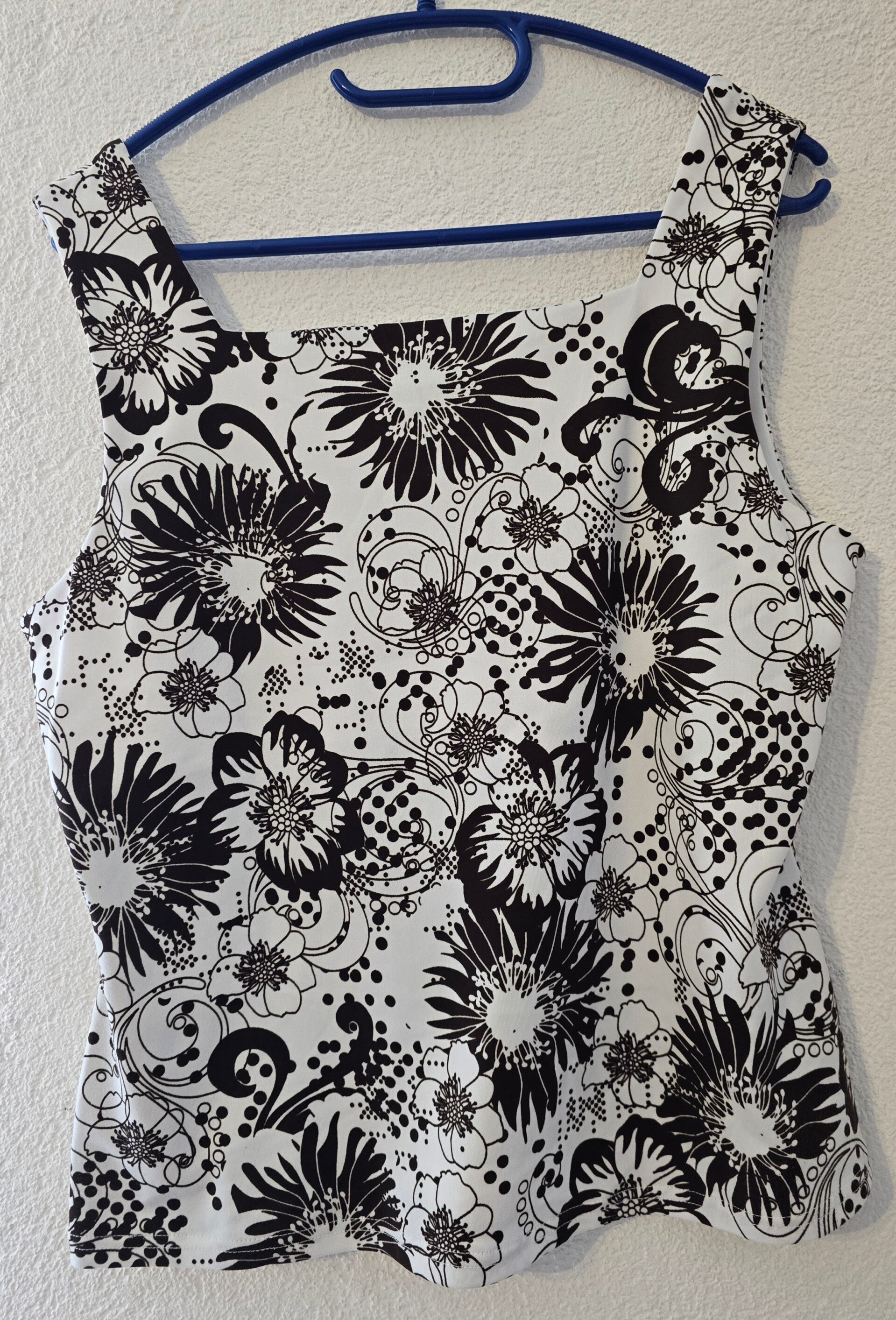 Elegantes ärmelloses Top von Biaggini in Grösse 48. Auffälliges Schwarz-Weiss Muster mit Blumen und Ornament. Idealb für festliche Anlässe oder als stilvoller Aktzent im Alltag.