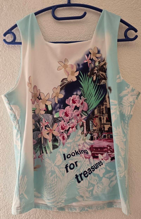 Sommerliches und farbenfrohes Top der Marke BIAGGINI in Grösse 48. Dieses einzigartige Oberteil besticht durch sein ansprechendes Design, das eine Kombination aus tropischen Blüten, Pflanzen und einem urbanen Stadtmotiv zeigt. Der Schriftzug "looking for treasures" rundet den besonderen Look ab. Das Top hat einen quadratischen Ausschnitt und ist perfekt für warme Tage und einen fröhlichen Freizeit-Look. Ideal für Frauen, die gerne auffällige Prints tragen und Komfort schätzen.