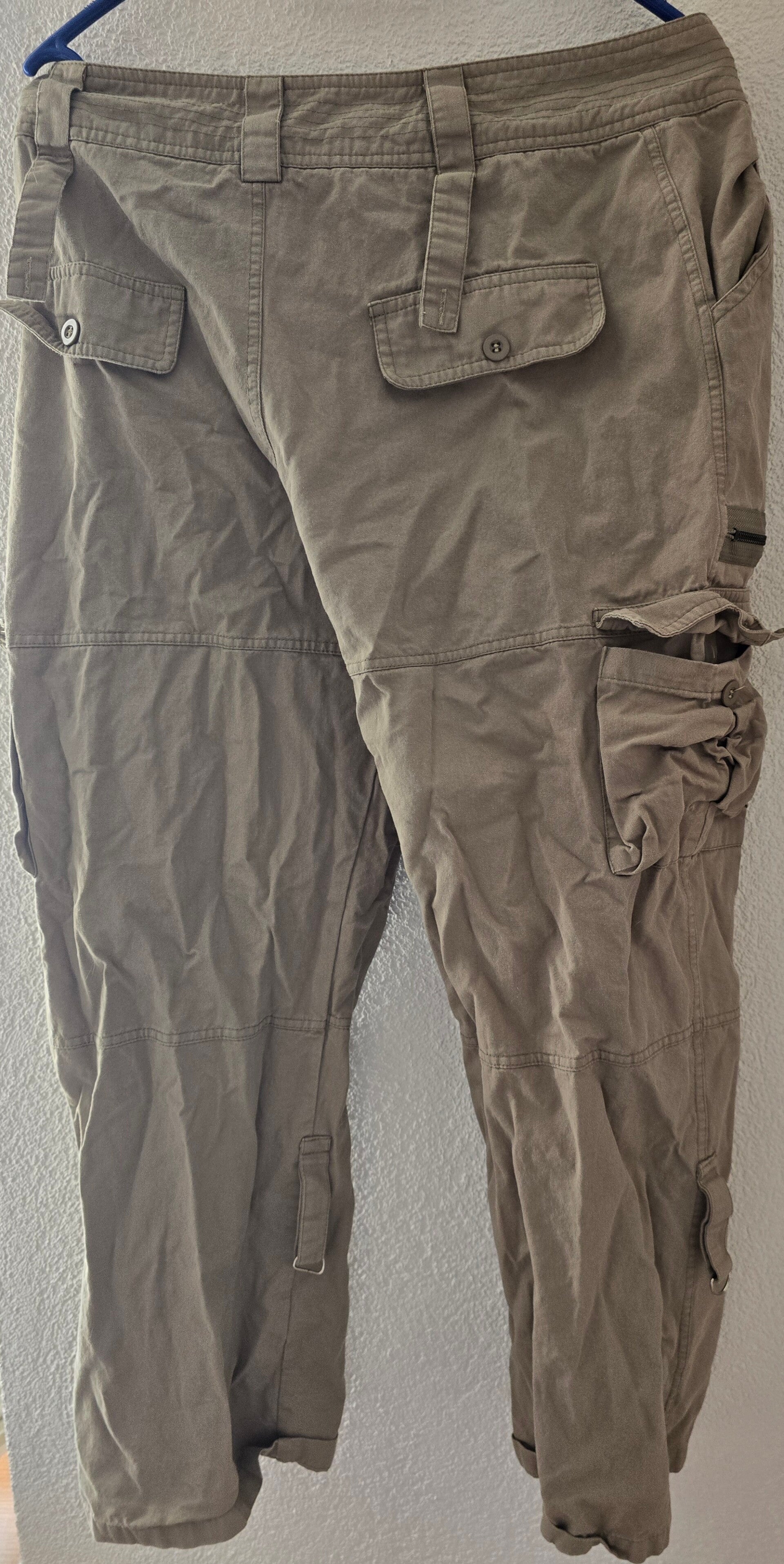 Robuste und vielseitige Cargo-Hose in Khaki/Olivgrün, Grösse L. Diese Hose bietet zahlreiche praktische Taschen mit Patte und Reissverschluss, ideal zum Verstauen von Kleinigkeiten. Der lässige Schnitt und das strapazierfähige Material sorgen für hohen Tragekomfort und Langlebigkeit. Sie kann als lange Hose oder als 3/4-Hose getragen werden (ggf. mit Knöpfen/Laschen zum Hochkrempeln, falls vorhanden und auf den Bildern nicht eindeutig ersichtlich). Perfekt für Freizeitaktivitäten, Outdoor-Abenteuer oder einen entspannten Alltagslook. Ein zeitloser Klassiker für jede Garderobe.
