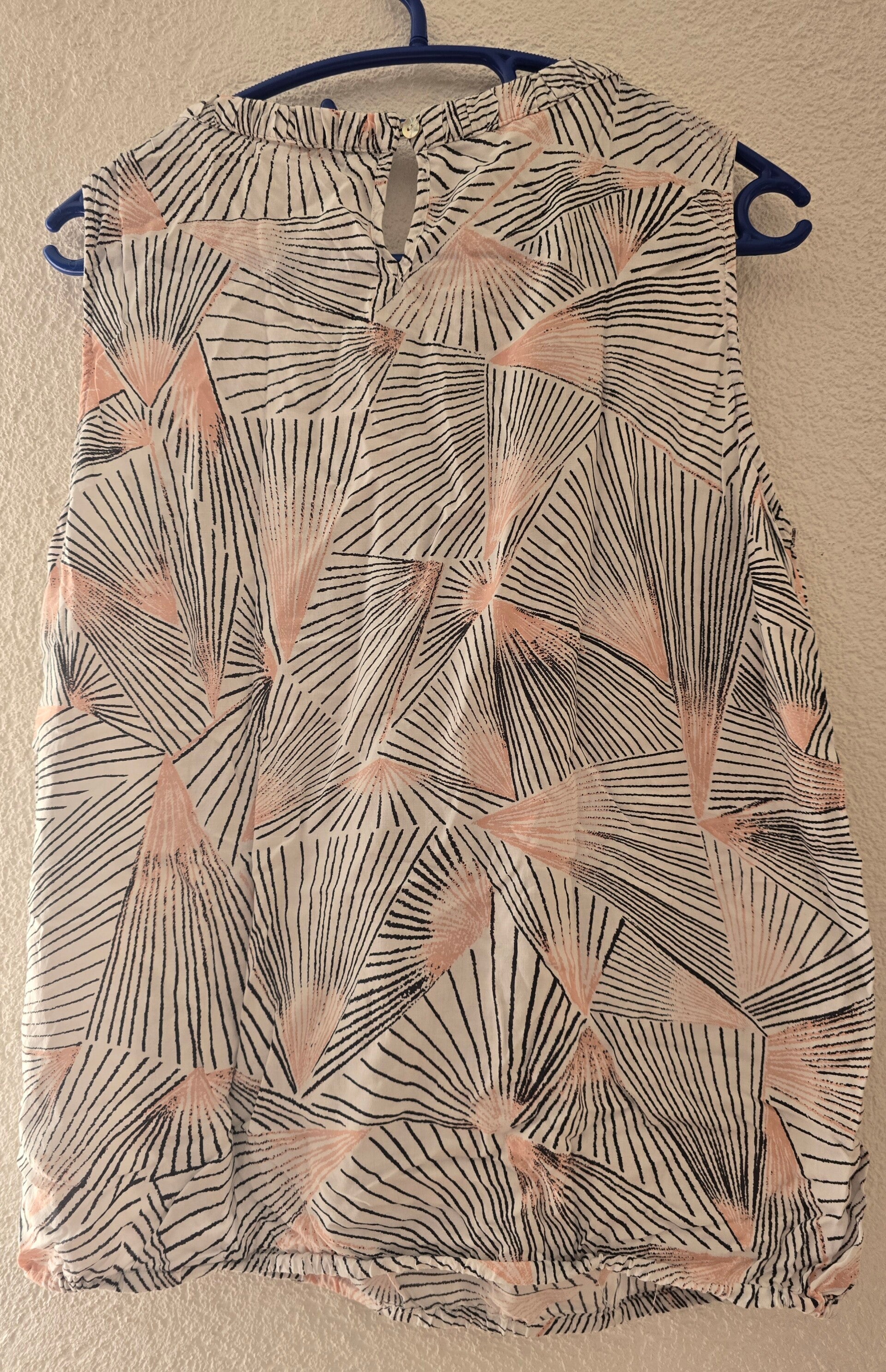 Stylisches ärmelloses Top der Marke Kenny S. in Grösse 40. Dieses leichte und luftige Oberteil besticht durch sein modernes, geometrisches Muster in Schwarz und zartem Rosa auf weissem Hintergrund, das an stilisierte Fächer oder Sonnenstrahlen erinnert. Es verfügt über einen eleganten Rundhalsausschnitt und einen kleinen Knopfverschluss mit Schlüssellochausschnitt im Nacken. Ideal für warme Tage und vielseitig kombinierbar – ob casual zur Jeans oder schicker unter einem Blazer. Ein tolles Basic für eine frische Sommergarderobe.
