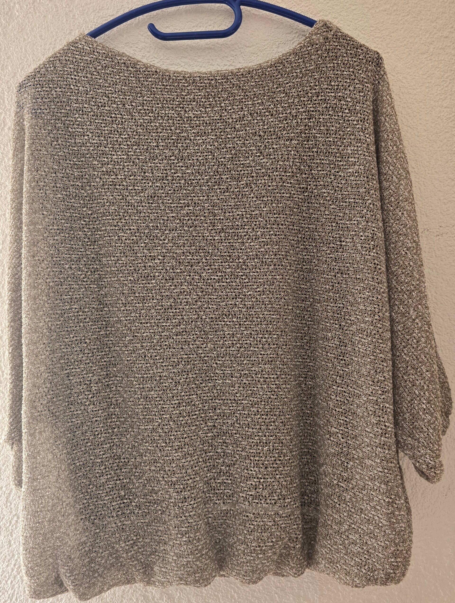 Bequemer Damen Strickpullover in Grösse L. Der Pullover hat eine lässige Passform mit weiten 3/4 Ärmeln und einen melierten Look in Grün weiss- Tönnen. Ideal für den Übergang oder kühle Sommertage