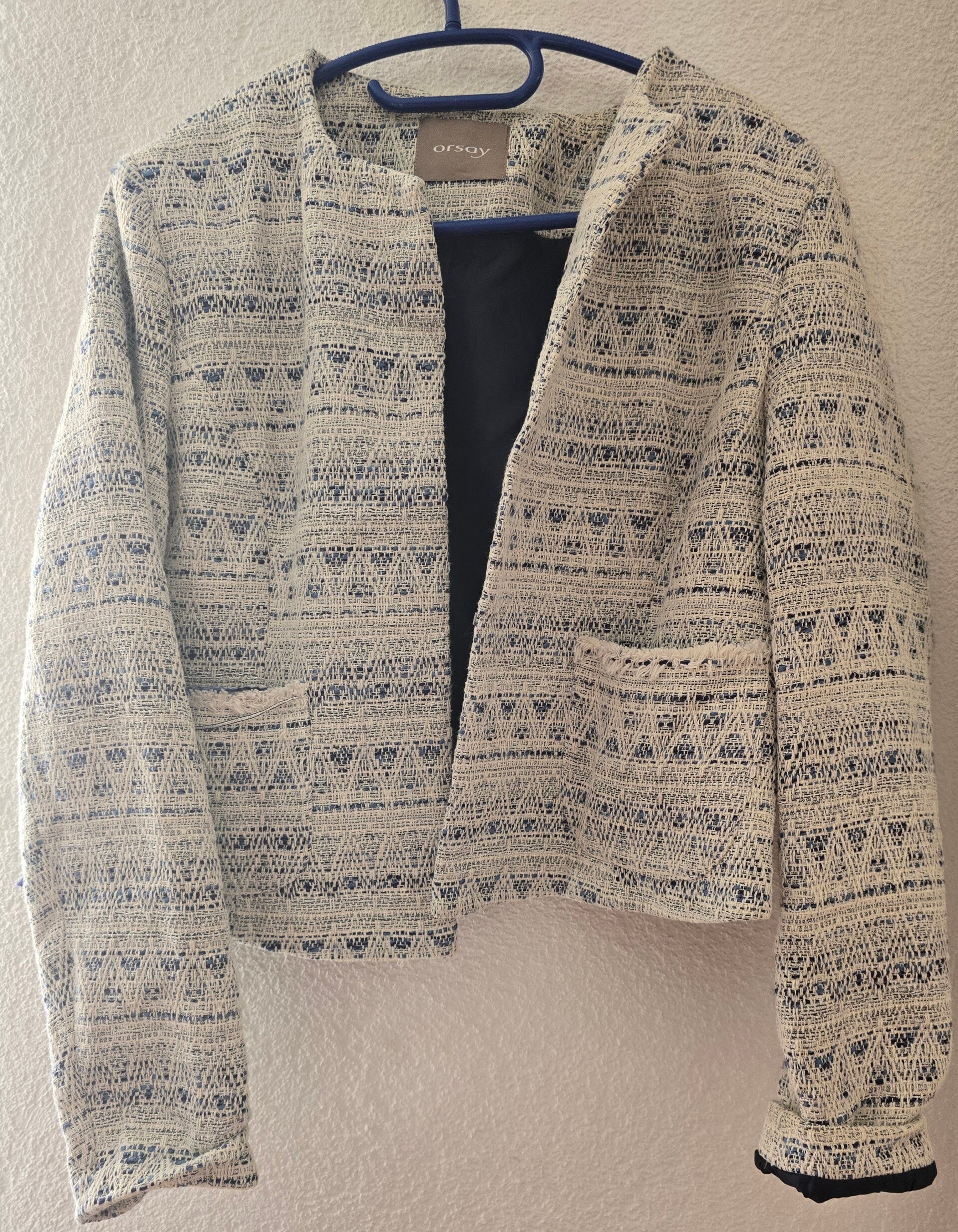 Verkaufe eine neuwertige und sehr elegante Damenjacke von Orsay. Die Jacke ist im Bouclé-Stil gehalten und überzeugt mit einem schönen Muster in hellen Tönen und Akzenten in Dunkelblau, das an klassische Chanel-Jacken erinnert.