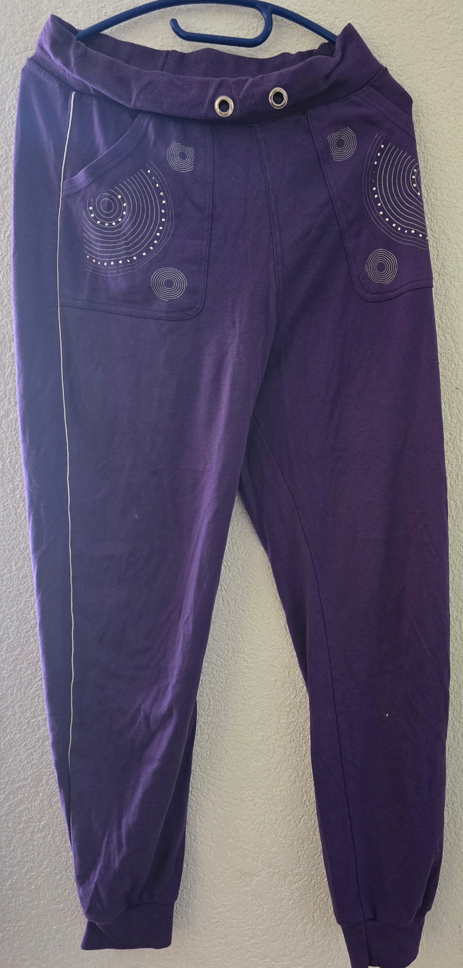 Verkaufe eine sehr bequeme und weiche Jogginghose für Damen. die Hose ist in einem schönen Lila-Ton gehalten und hat eine interessante, wiesse Stickerei mit Kreismotiven auf den Taschen. Ein weisser Seitenstreifen entlang eines Beines sorgt für einen sportlichen Akzent.