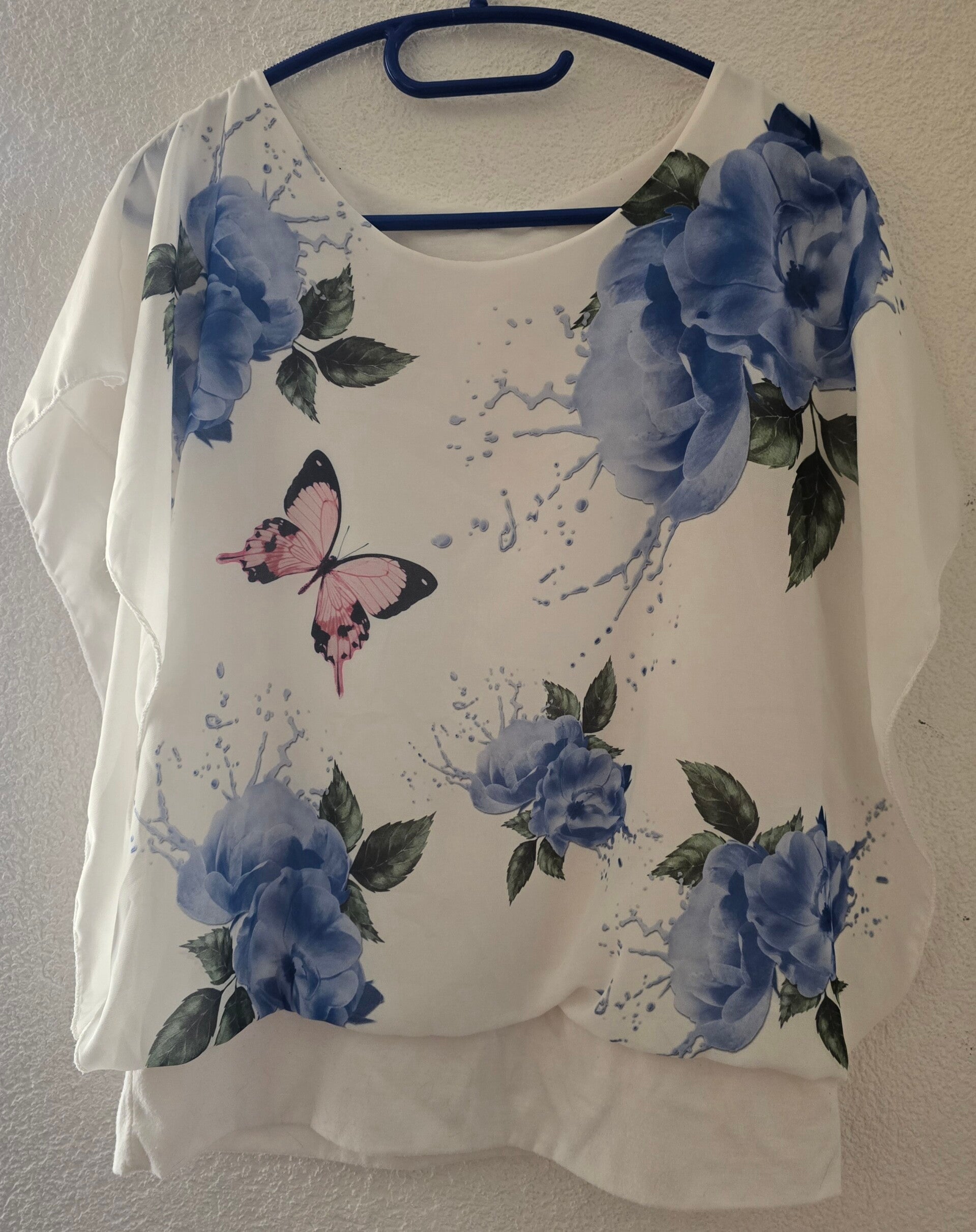 Verkaufe eine wunderschöne und leichte Tunika/ Bluse in Gr. L. Das Oberteil besticht durch seinen eleganten Print mit grossen blauen Rosen und einem zarten pinkfarbenen Schmetterling auf weissem Hintergrund. Der Schnitt ist locker und fliessend mit weiten Ärmeln une einem Gummizug am Saum, der für eine schöne drapierte Optik sorgt.