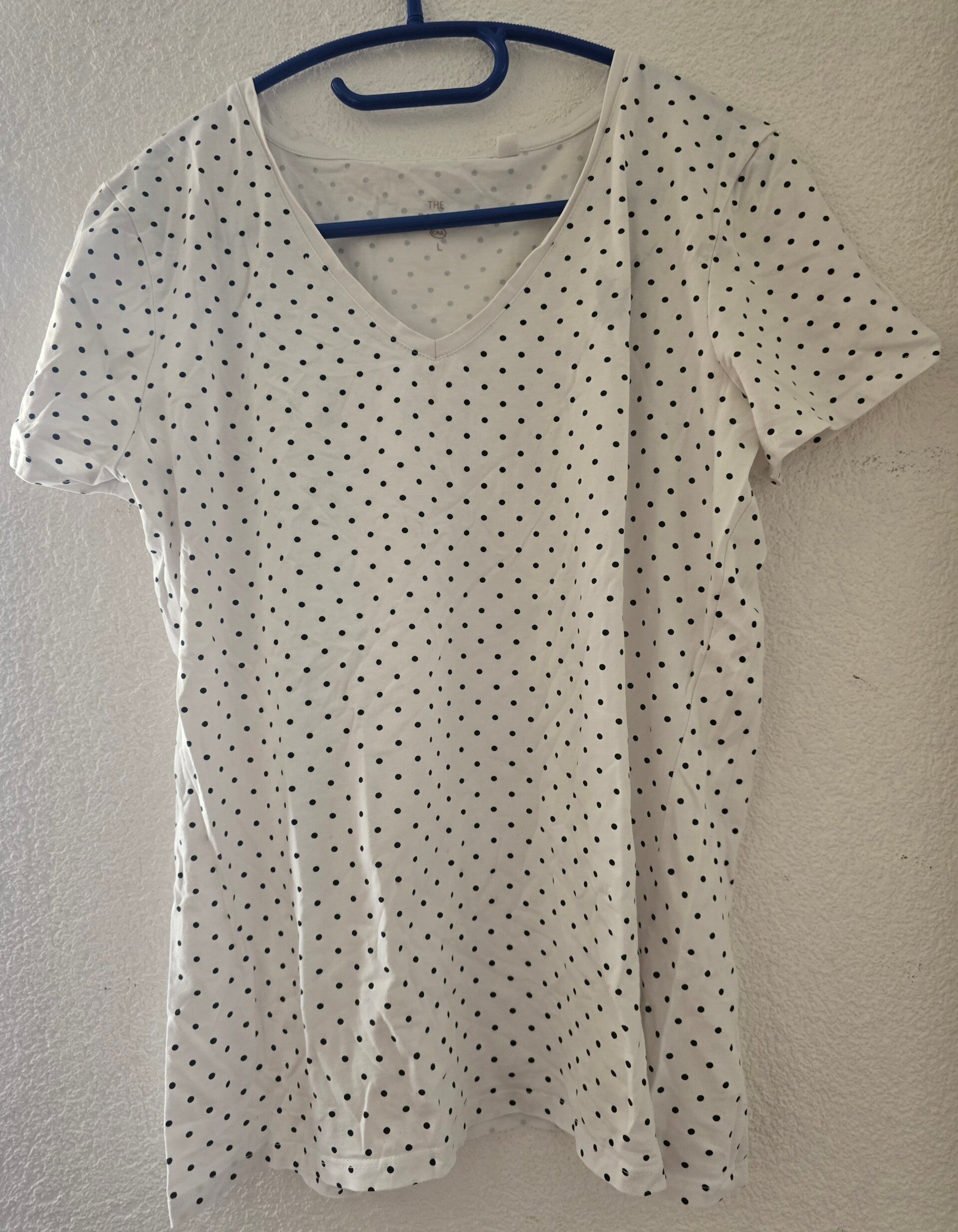 Verkaufe ein klassisches T-Shirt von C&A. Das Shirt ist weiss mit einem charmanten Muster aus schwarzen Punkten und hat einen bequemen V-Ausschnitt.