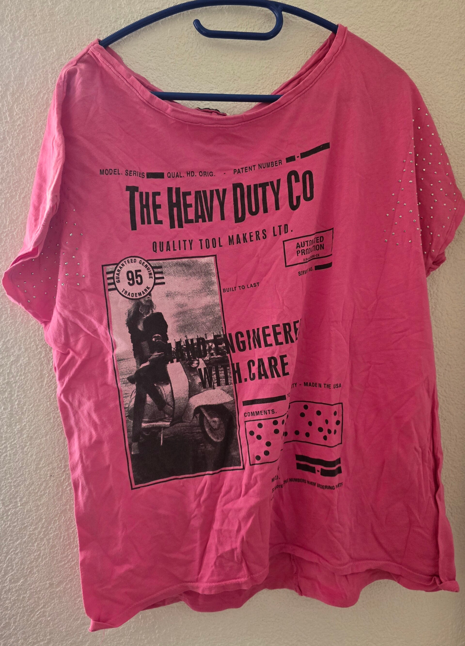 Trendiges Damen T-Shirt von MiLady in Grösse XL. Das Shirt ist in einem kräftigen Pink gehalten und verfügt über einen coolen Frontprint " THE HAVY DUTY CO" sowie kleine Nietenapplikationen auf den Schultern/Ärmeln. Bequemer Schnitt.