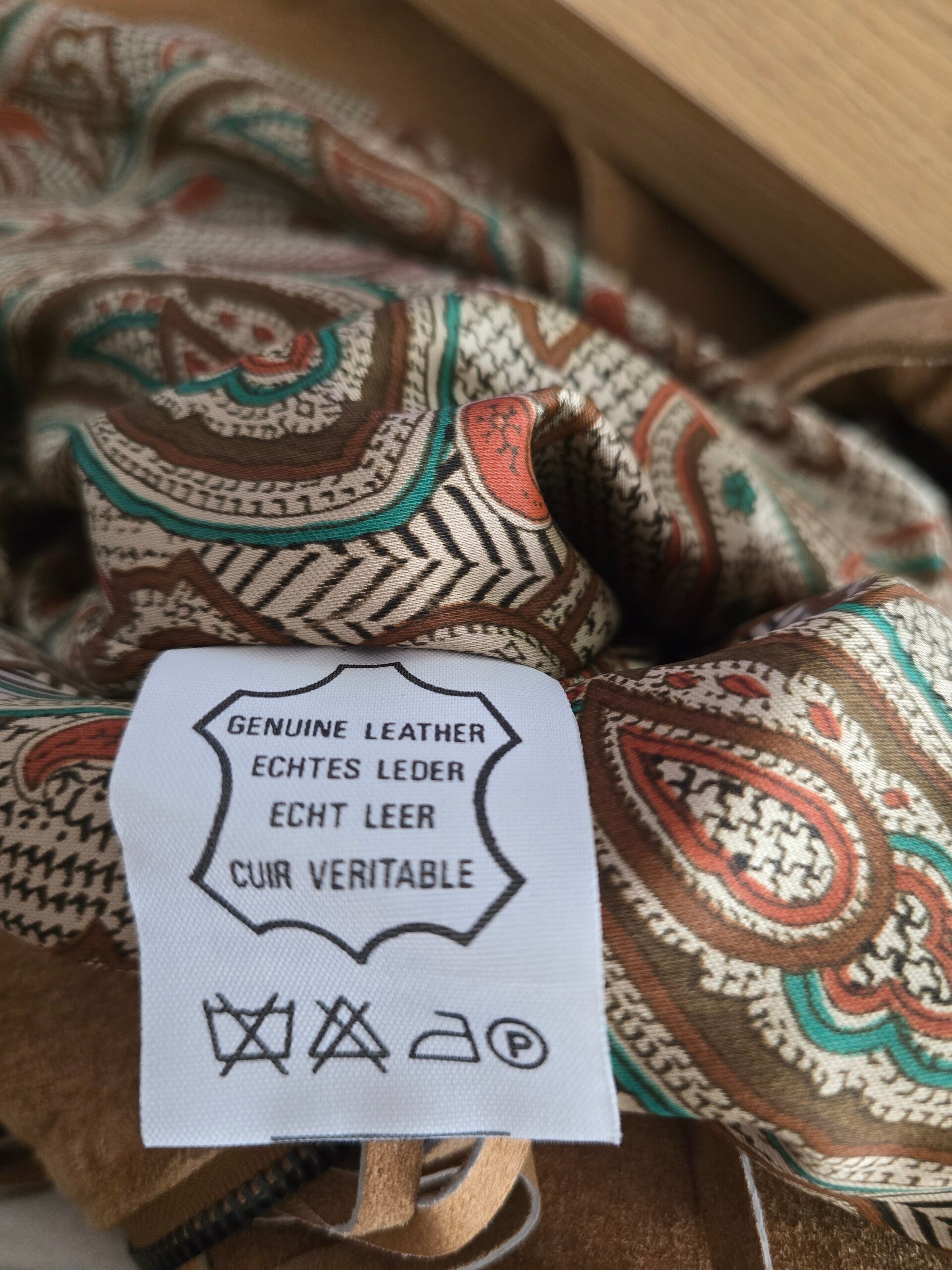 Stylische Wildlederjacke in Grösse 40 mit cooler Fransenverzierung. Gefertigt aus echtem, weichem Leder in einem schönen Braunton. Das exteavagante Innenfutter mit Paisleymuster rundet den Look ab. Eine Must-have für Liebhaber des Boho- oder Western-Looks.