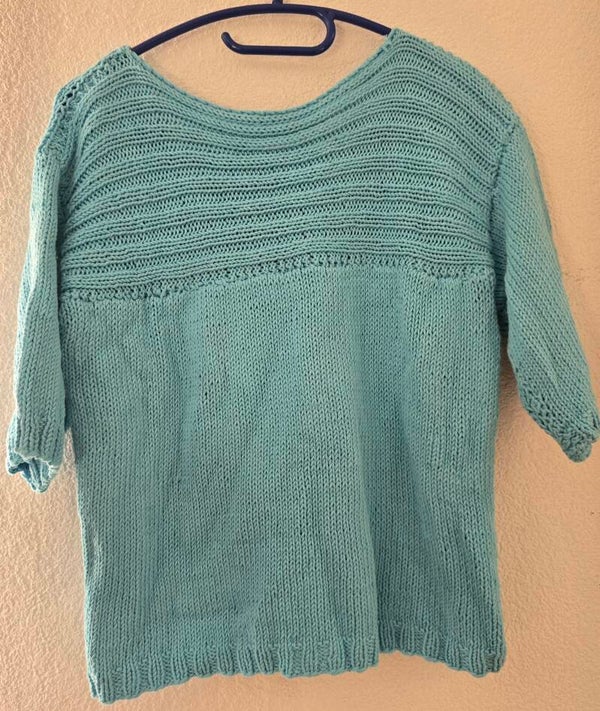 Dieser einzigartige, handgestrickte Damen Pullover in einem schönen Hellblau ist in Grösse L verfügbar. Das besondere Design zeichnet sich durch ein breiteres Rippenmuster im oberen Bereich des Pullovers und an den Schultern aus, das einen schönen Kontrast zum glatt gestrickten Hauptteil bildet. Die Ärmel sind dreiviertellang und mit Bündchen abgeschlossen. Ein gemütliches und individuelles Stück für Ihre Garderobe.