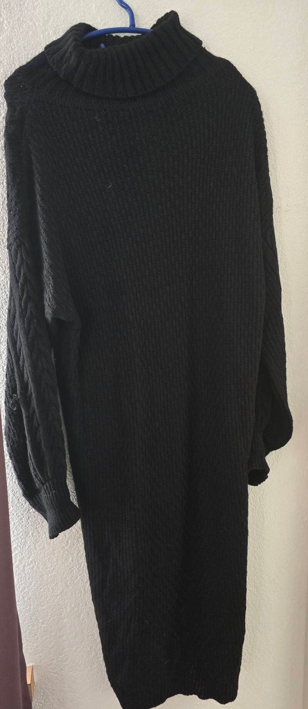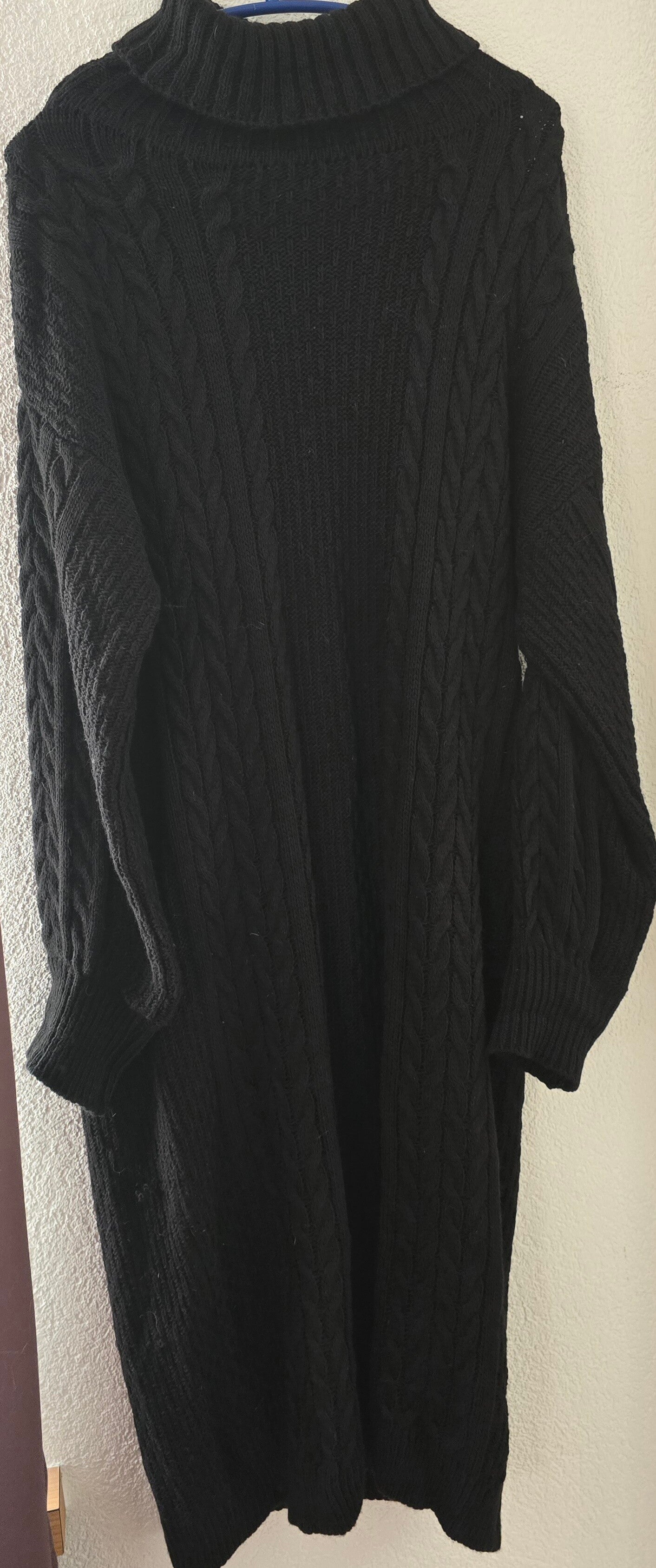 Dieses elegante, handgestrickte Damen Strickkleid in klassischem Schwarz ist in Grösse L erhältlich. Das Kleid besticht durch ein wunderschönes Zopfmuster an den Seiten und Ärmeln, das dem schlichten Design eine besondere Textur verleiht. Es verfügt über einen gemütlichen Rollkragen und lange, leicht voluminöse Ärmel mit Rippenbündchen. Durch den geraden Schnitt ist es vielseitig kombinierbar und ideal für die kälteren Monate.
