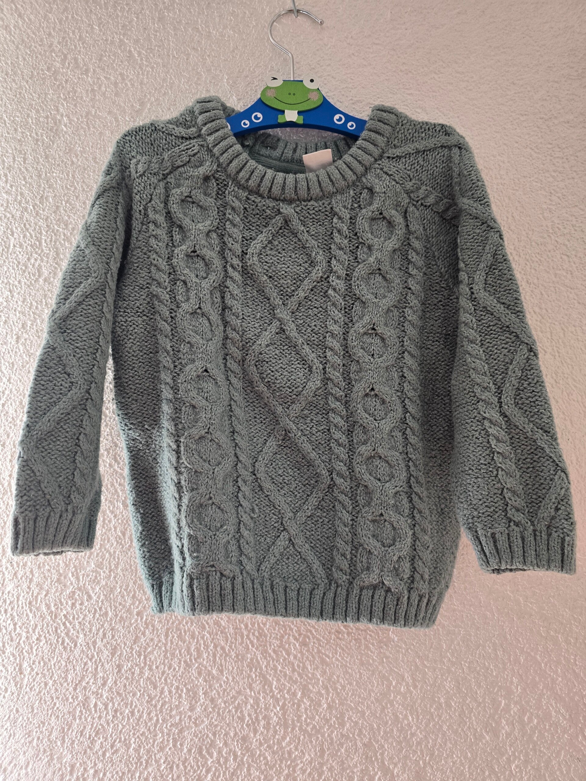 Kuscheliger und schöner H&M Strickpullover in Grösse 92. Der Pullover in einem schönen Grünton besticht durch sein klassisches Zopfmuster auf der Voderseite und den Ärmeln. An der Schulter befinden sich zwei Knöpfe, die das An- und Ausziehen erleichtern. Ideal für die èbergangszeit und kalte Tage, hält schön warm.