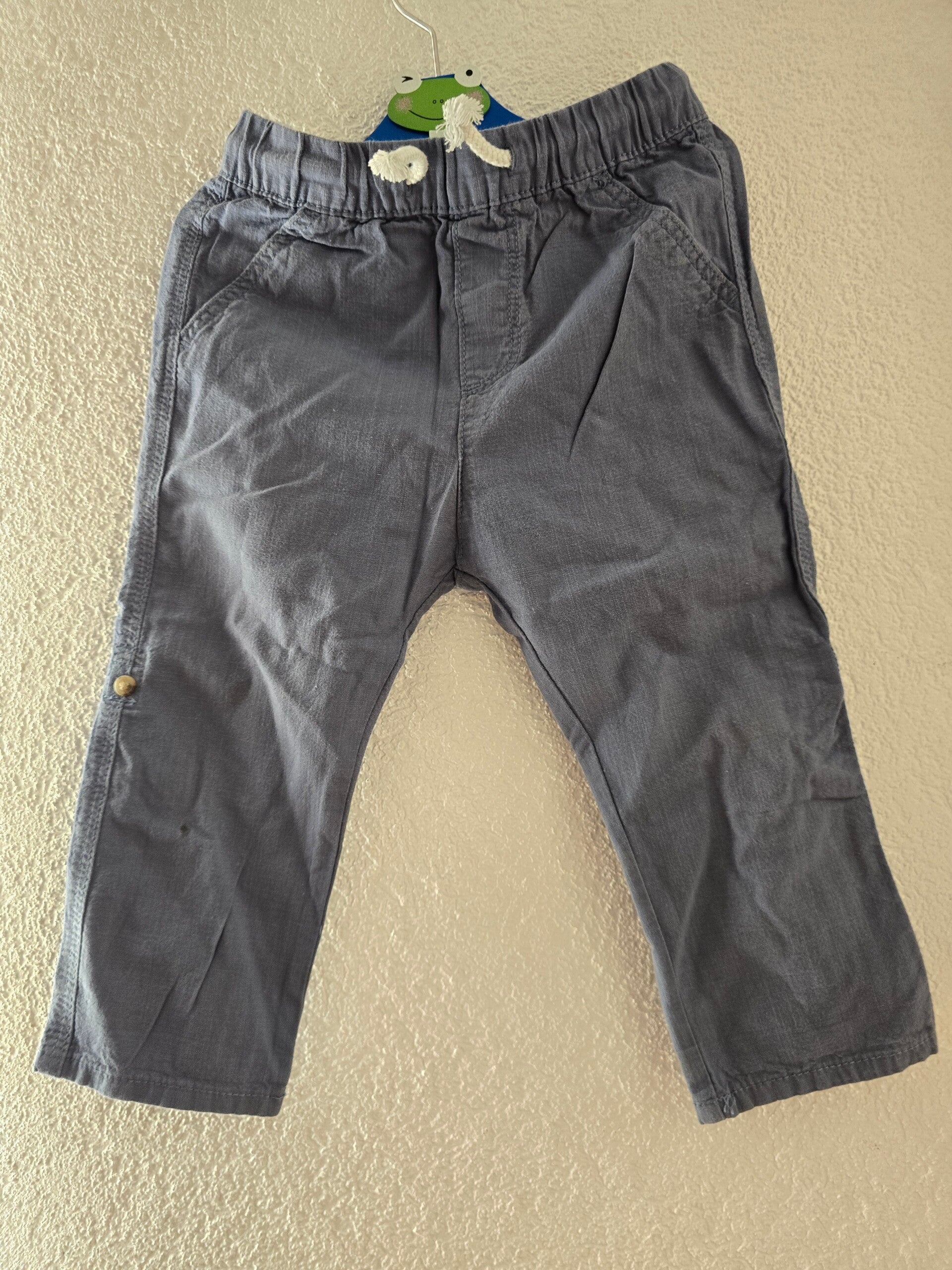 Praktische und bequeme H&M Hose für Babys oder Kleinkinder, Grösse 92. Diese Hose in einem vielseitigen Blau/Grau-Ton verfügt über einen elastischen Bund mit einem dekorativen Kordelzug für einen guten Sitz. Besonderes Detail sind die Krempelbaren Hosenbeine mit Knopfverschluss, die die Hose vielseitig tragbar machen - ideal für wrchselhaftes Wetter oder wenn das Kind noch wächst. Mit zwei Vordertaschen und einer Gesässtasche.