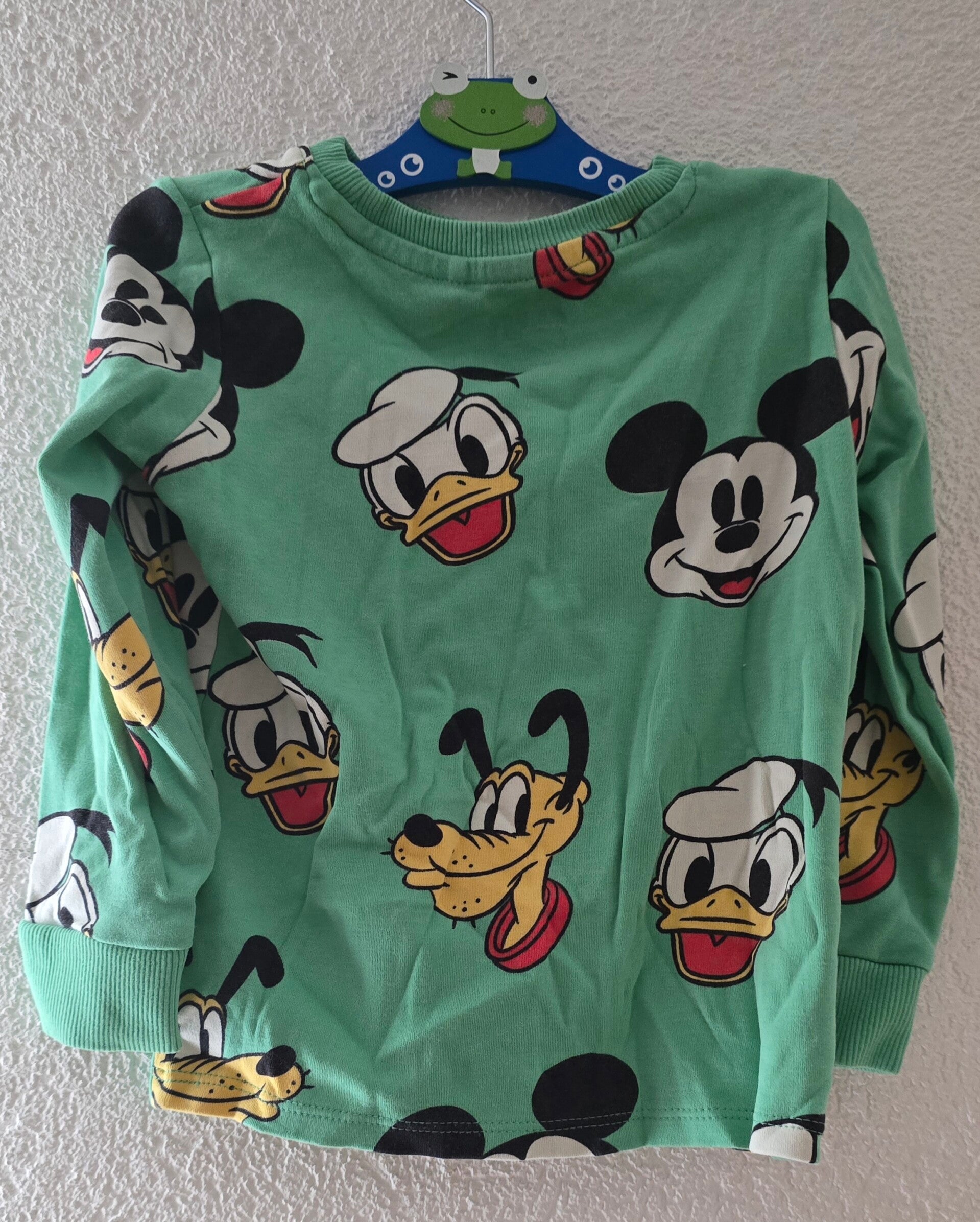 Verkaufe ein süsses Disney Langarmshirt in Grösse 104. Das Shirt ist hellgrün und mit verschiedenen Disney-Figuren wie Mickey Mous, Donald Duch und Pluto bedruckt. Es ist in gutem Zustand. Ideal für kleine Disney-Fans.