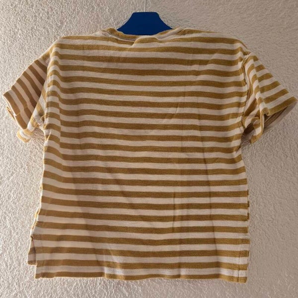 Trendiges und bequemes Zara T-Shirt für kinder in einem stilvollen Streifmuster in Gold/Senfgeld und Weiss. Das Shirt ist in Grösse 98 und verfügt über eine aufgesetzte Brusttasche, die dem Design einen lässigen Touch verleiht. Hergestellt aus einem angenehmen Material, ist es ideal für den Frühling und Sommer und bietet Ihrem Kind optimalen Tragekomfort.