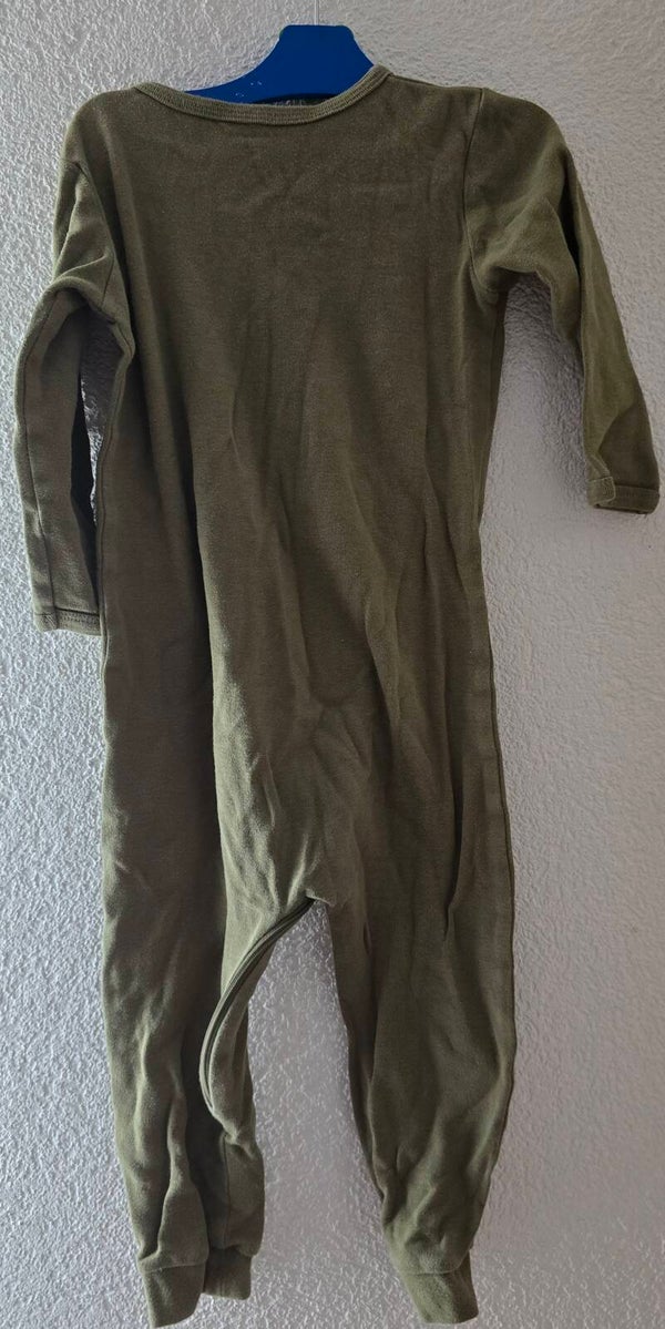 Bequemer Kinder-Overall/pyjama in Olivgrün mit Dinosaurier-Applikation. Durchgehender Reissverschluss