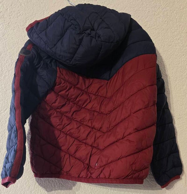 Die Jacke ist in einem attraktiven Zweifarbendesign gehalten: der obere Bereich und die Ärmel sind dunkelblau, während der untere Bereich und der Rumpf in einem kräftigen Rotton gehalten sind. Der Stepp-Look verleiht ihr eine moderne Optik und sorgt für leichte Wärme. Sie verfügt über eine Kapuze und einen praktischen Reissverschluss vorne.